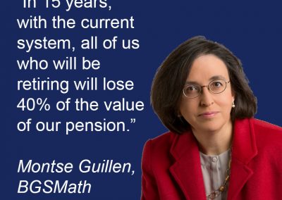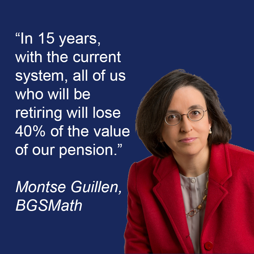 Risk expert Montse Guillen has strong opinions about pensions. She notes that the current pension system in Spain and in many other western countries is mathematically unsustainable and believes it should be totally redesigned, giving more responsibility to the individuals. The key factors that make it unbalanced are increasing life-expectancies, low salaries and the need to guarantee an basic income level to all pensioners. Possible solution? Lower pensions at 65, higher after 80.