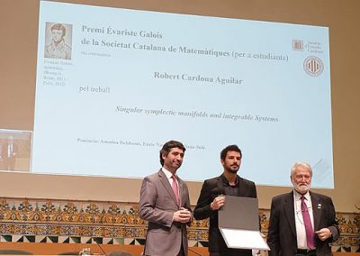 Dolors Herbera, professor at UAB and also a BGSMath Faculty member, who is the new president of the SCM, handed them the award in a ceremony at the Institut d’Estudis Catalans. The Évariste Galois Award is aimed at students of a master’s or doctorate degree for unpublished research, bibliographic or mathematical essay and was established in 1962. It is inspired by the French mathematician Évariste Galois who was just 20 when he died in 1832 from wounds suffered in a duel.