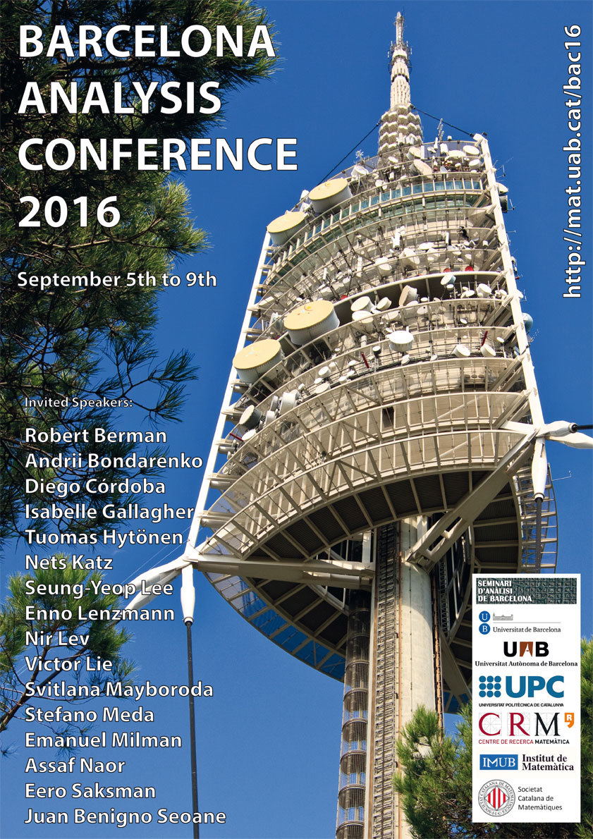 The BAC16 conference, from September 5 – 9, 2016, is a continuation of the BAC06 conference, held also in Barcelona in September 2006. As in 2006, the main objective of the conference is to gather leading researchers in Mathematical Analysis and close areas to present the latest developments and discuss future lines of research.