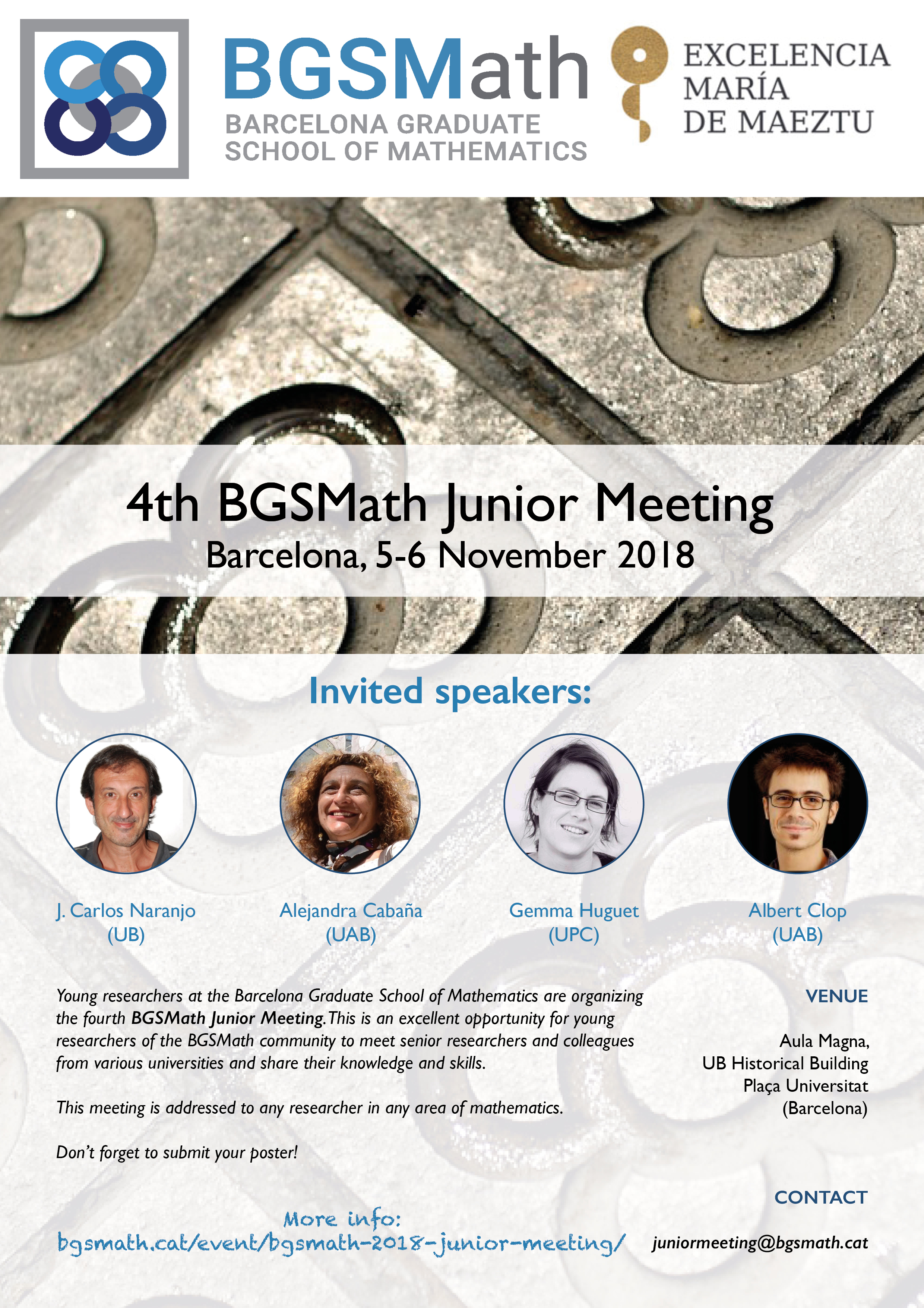 The Barcelona Graduate School of Mathematics is organizing its fourth BGSMath Junior Meeting. This is an excellent opportunity for young researchers of the BGSMath community to meet senior researchers and colleagues from various universities and share their knowledge and skills.