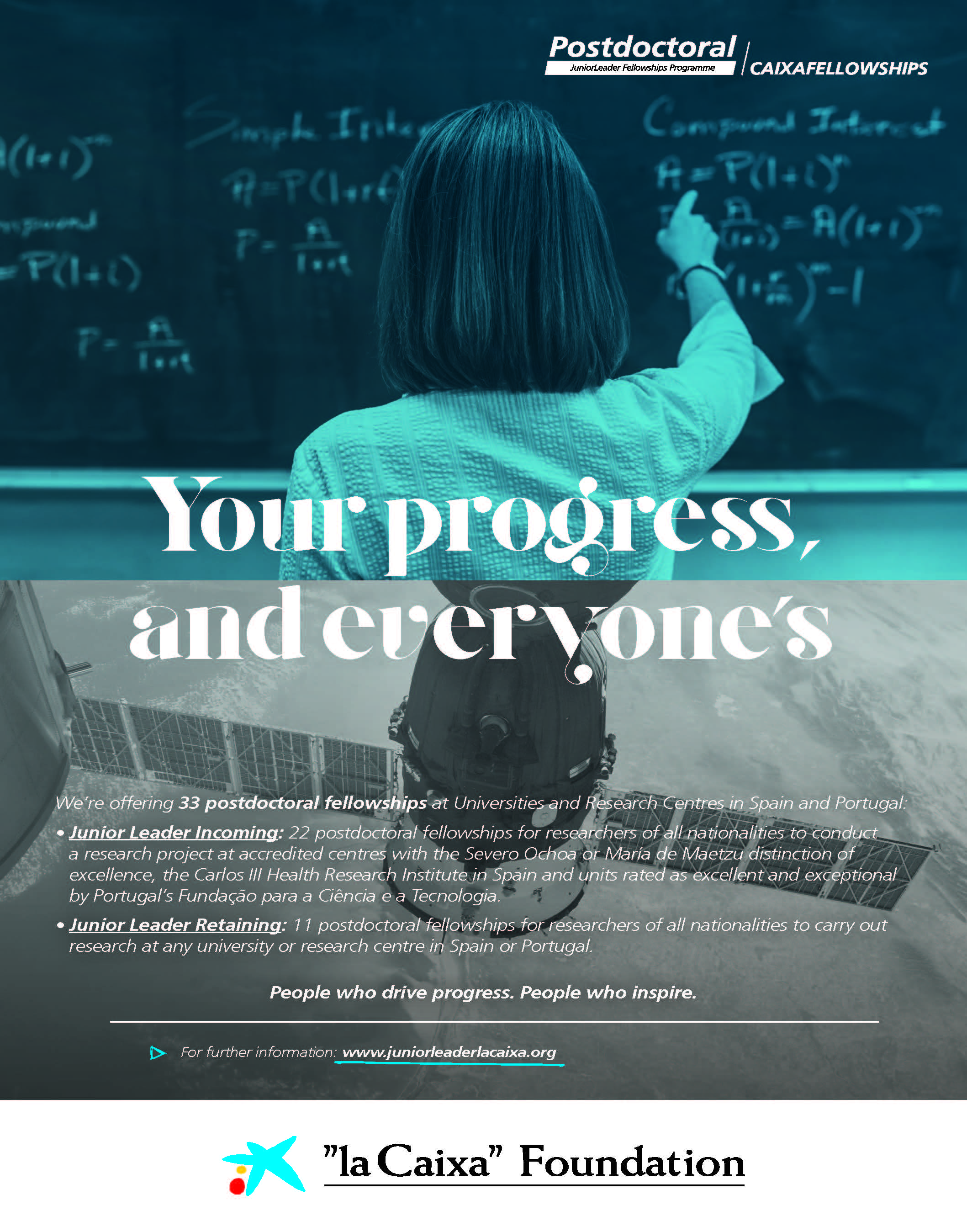 • “la Caixa” Junior Leader – Retaining: 11 postdoctoral fellowships for researchers of all nationalities to carry out research at any university or research centre in Spain or Portugal. For Spanish institutions, candidates must have resided in Spain more than 12 months in the last three years while for Portuguese institutions, candidates must have resided in Portugal more than 12 months in the last three years.