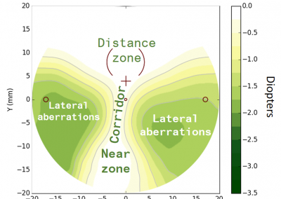 You could try to figure out a surface that solves this problem. Our approach is different: we use optimization methods. We use the prescription power of the near and far vision to calculate the surface of the lens. In principle, people who wear our lenses have three focusing points: near vision (for reading), middle vision (looking at a screen), and far vision. We obtain a personalized lens for our clients by a careful calibration of something called “corridor length”, an area connecting the far-vision area of the lens to the near-vision area.