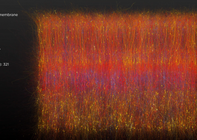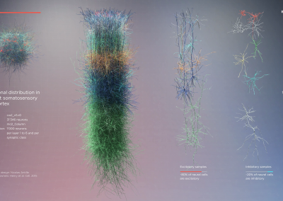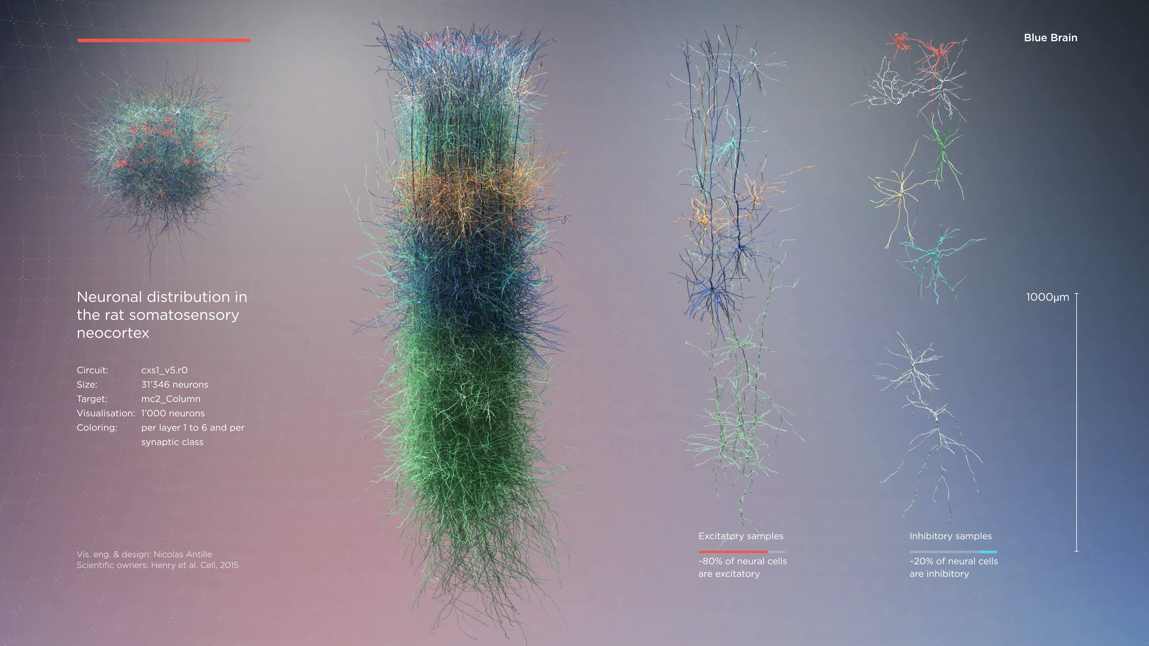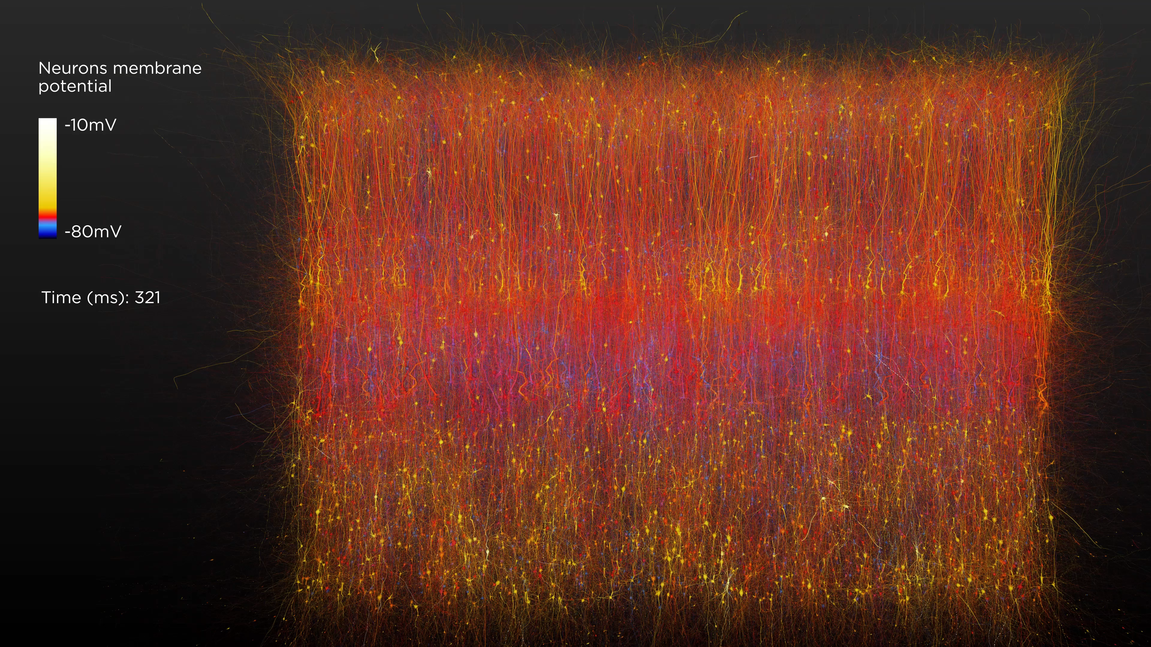 The objective of the project is to reconstruct digitally and simulate activity in the brain of a rat, and ultimately the human brain. The human brain is formed by hundreds of billions of neurons and hundreds of trillions of synapses, through which electrical currents flow. The rat brain is smaller (2g vs 1.2 kg), but the structure is still complex, and its neocortex is similar. It has hundreds of millions of neurons and hundreds of billions of synapses! It’s like a “warm up” exercise for the human brain, but it’s still too much data to collect. So, we need to make a few well-chosen measurements to construct a model of the brain. The building blocks of the model are of course the neurons, the processing units of the brain. They come in different forms and shapes – there are 55 morphological types in our model! We use supercomputing to construct and simulate activity in this model, and we exploit the interconnections between biological experimental data. This way, we can produce models of the brain with very fine biological detail. The goal is to design a computer model of the rat’s neocortex as biologically accurate as possible in order to analyse its structure and functions.