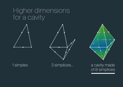 People are often scared by the word “dimension”. It is just a way to say how big structures are. There are families of neurons working together to transmit messages further; the dimension is just the number of neurons working together (minus 1). If you represent these families geometrically, those are the dimensions that arise. The building blocks of the brain – i.e. the families of neurons – are put together in different ways. It’s like when you build a castle: how many windows and room does it have? In a topological space, we use something called Betti numbers: they count the cavities and loops arising from the way the neurons are connected together.