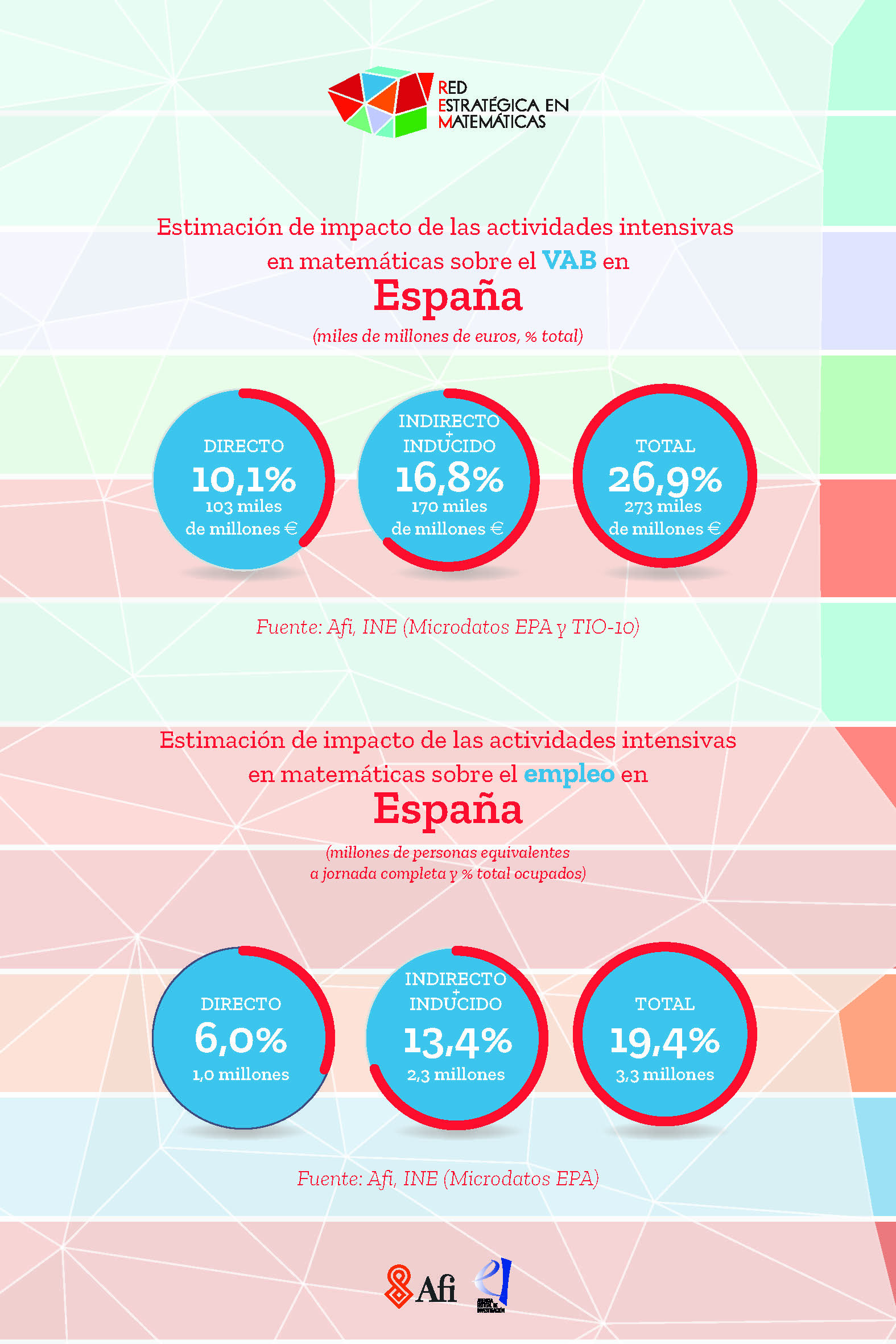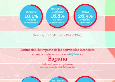 - Si se añade el impacto indirecto e inducido de las matemáticas sobre otras actividades económicas en España, las cifras alcanzan el 19,4% del empleo y el 26,9% del PIB.