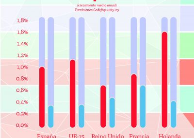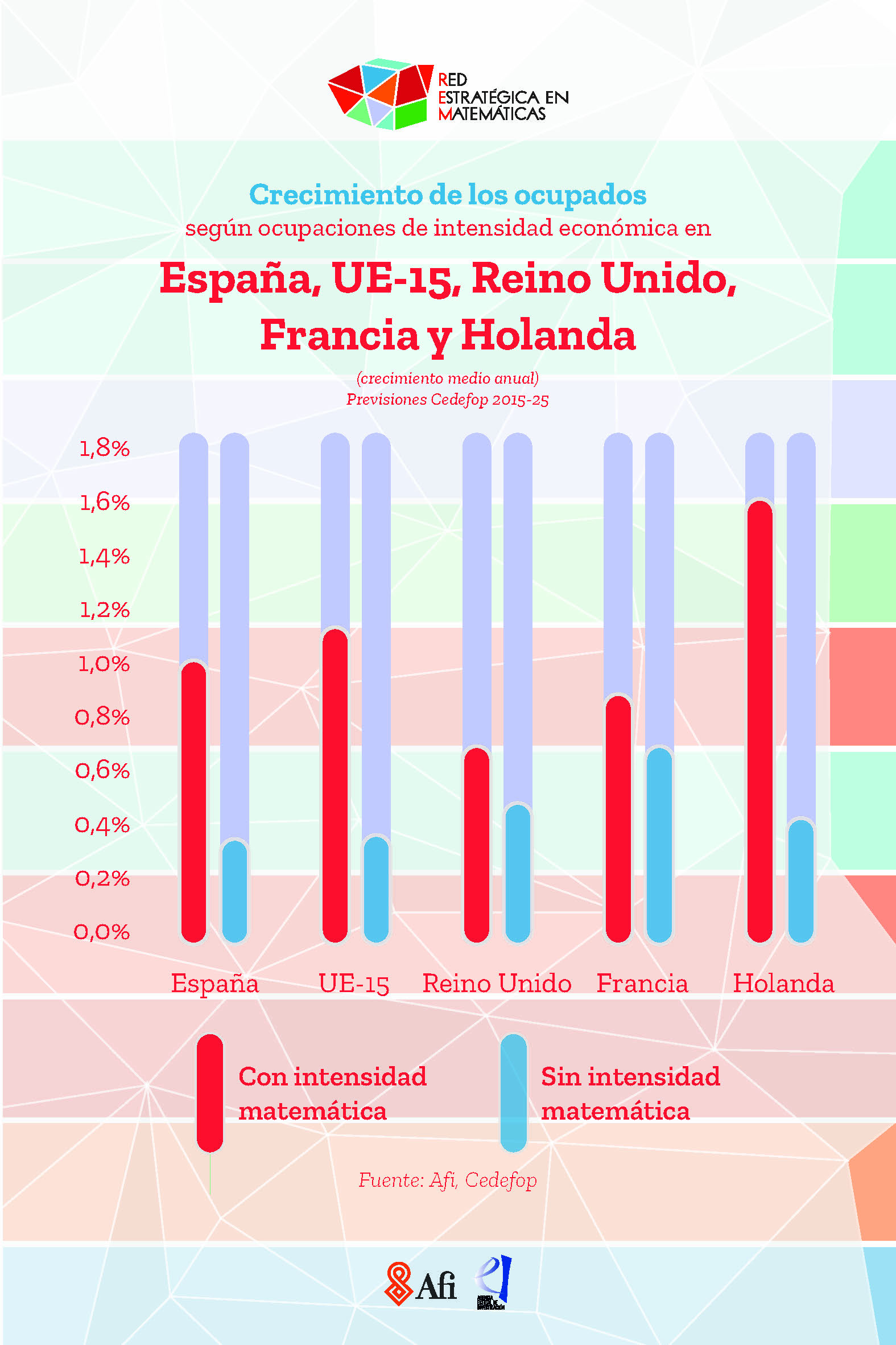 No son muy buenas noticias de cara al futuro, porque según la agencia de la Unión Europea Cedefop (Centro Europeo para el Desarrollo de la Formación Profesional), las previsiones de crecimiento de las ocupaciones intensivas en matemáticas para entre 2015 y 2025 son menores para España (0,47% anual) que para la Europa de los 15 (0,59% anual), “lo que ampliaría la diferencia actual”, señala el informe. “Eso a pesar de que las perspectivas de crecimiento del empleo para estas profesiones más que duplica las del resto de ocupaciones”.